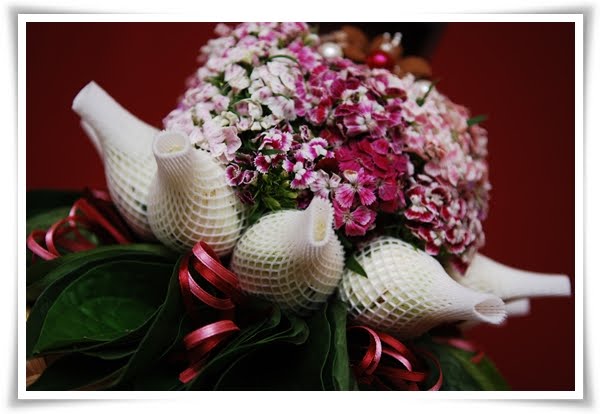 latest hantaran tempah by my ofcmate tuk biras dier nyer adik.. hah, kirer yg tukang tempah pon tk kenal saper pengantinnyer..per nak kata bukan bau2 bacang dah nie..bau2 kentut jek..hehehe..tp nk dijadikan cter, on d day nak amek brg hantaran pengantin yg dtg amek sendiri kat rumah aku..tup tup classmate incik somi kat teknik PD dulu..what a small world kan..siap dah terima jemputan thru FB lagik..so dah siap jejak kasihan bagai n pengantin bagik kad..kene la pegi next saturday nie..tk bleh ngelat..hehehe..hah gitu la story mory of d hantaran kali nie..sumernyer ader 10 + jambangan bunge.. then aku ader wat hand bouquet pressie tuk bride..hepy viewing..